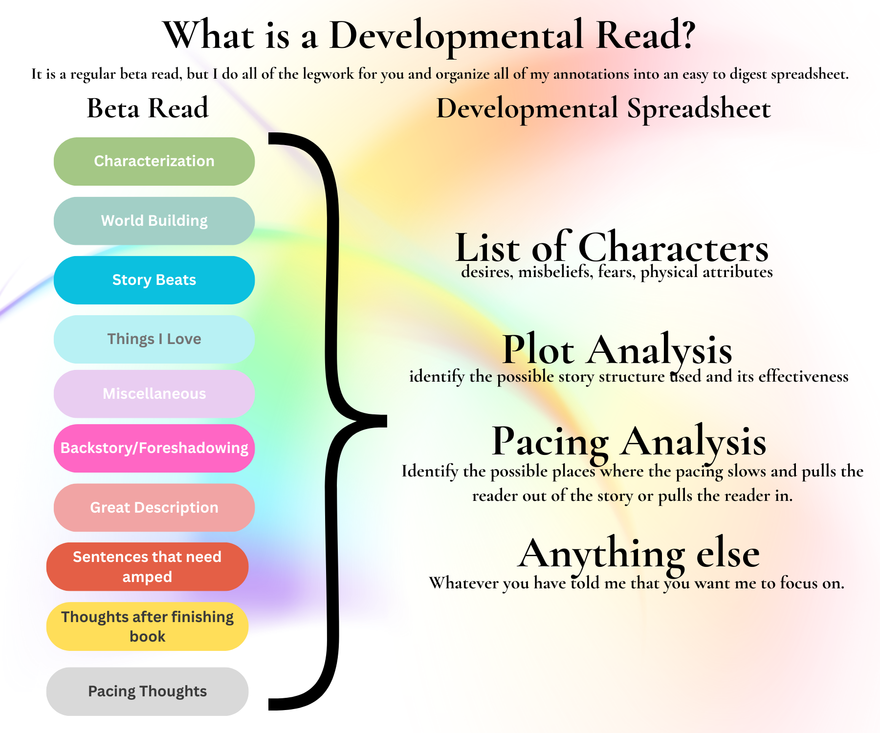 Developmental Reads are a step up from a Beta Read. You will still receive the annotated manuscript for your perusal. However, you will also receive a document that explains all of the categories in an easy to digest format. This will help you see the areas in your story that could be improved as well as areas that are working well for your revision process.
